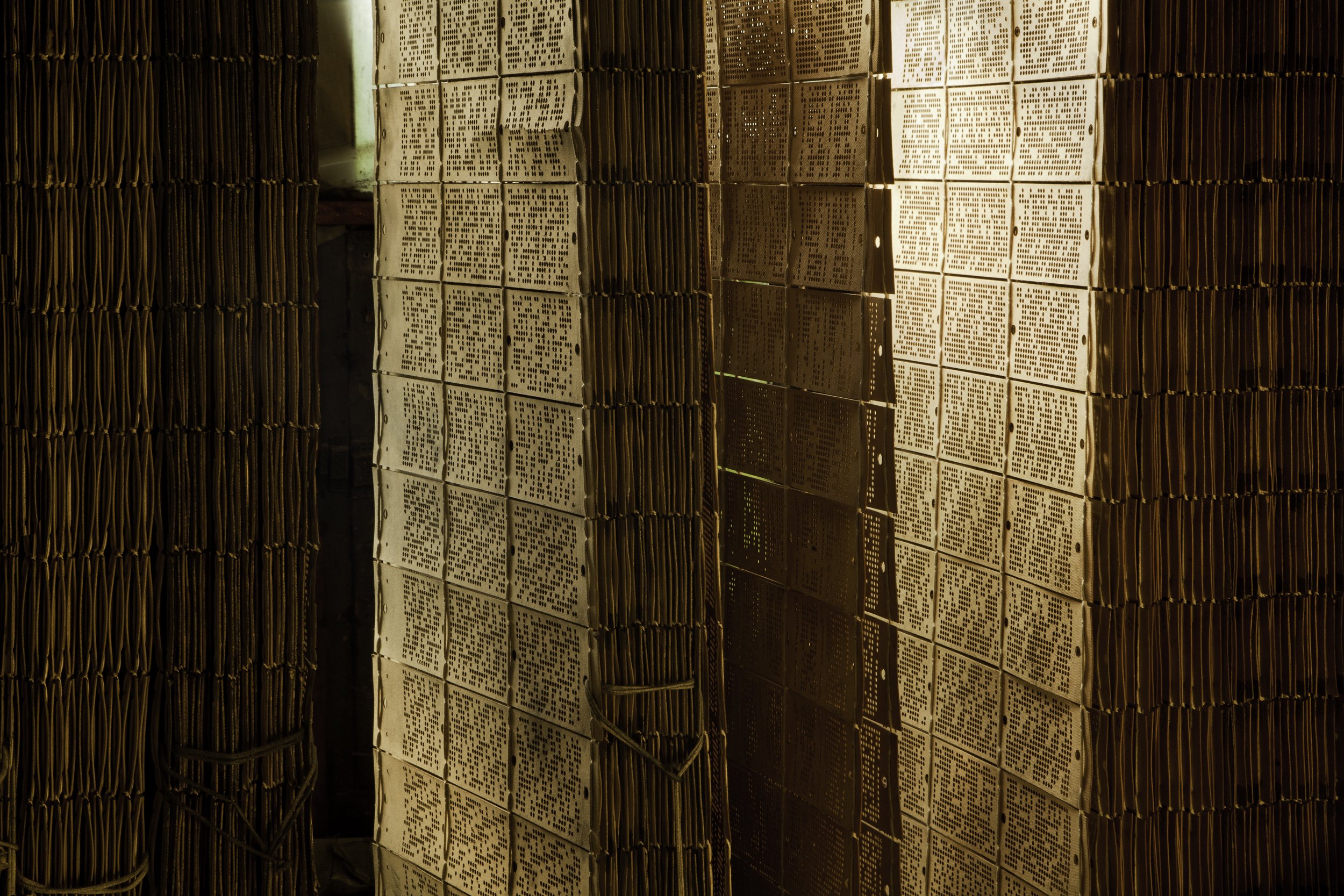Friends of friends, after seeing my photographs of deteriorating signs and understanding my affinity for things that are not what they used to be, put me in touch with the current owner of Scranton Lace. In February 2010, I spent two days shooting there in what I thought would be my first and last visit to Scranton. But when I processed my pictures, I realized that I was only just getting acquainted with the factory. I was fascinated by this place where time literally stood still, and one could walk through different areas like an archeologist sifting through the layers of history. The magnificent old Nottingham looms from the early 20th century with unfinished lace still in them. The groups of old Singer sewing machines pushed together under large plastic sheets like ships in a bay waiting for a storm to pass. Huge sheets of punch-cards hanging from the racks or stored in many layers, predecessors of now obsolete computer punch-card technology. Zeroes and ones. Hole or no hole. Lace pattern is made when the needle goes through the hole or is blocked by the card.